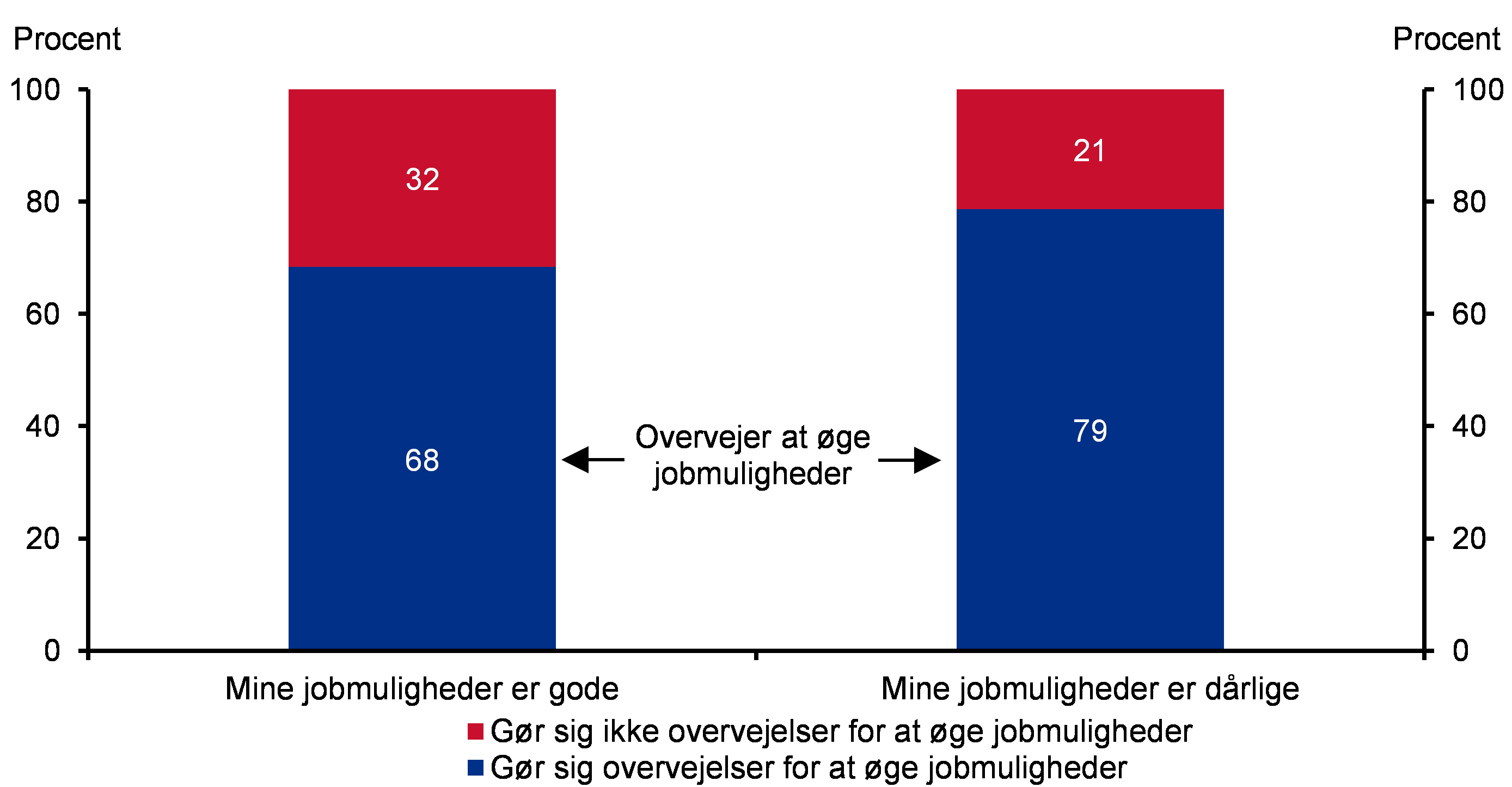 Knap 70 procent af de nyledige overvejer et eller flere af ovenstående tiltag for at forbedre deres jobchancer. For nyledige, der vurderer, at de ikke har gode jobmuligheder overvejer dog i højere grad tiltag, der kan øge deres jobchancer, sammenlignet med personer, der vurderer, at de har gode jobmuligheder, jf. figur 1.