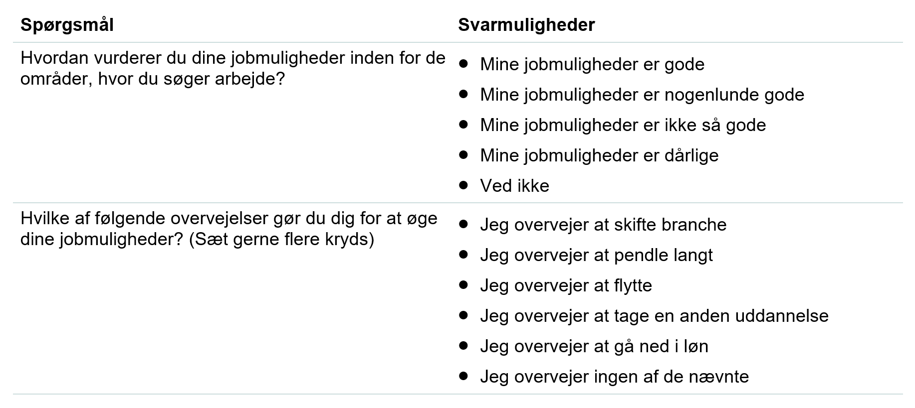 Analysen er baseret på forberedelsesskemaet, der er et spørgeskema, som nyledige dagpengemodtagere møder i begyndelsen af deres ledighedsforløb på Jobnet.dk. Her kan de frivilligt besvare ti spørgsmål om sig selv, deres baggrund, deres jobsøgningsadfærd med videre. Denne analyse tager udgangspunkt i spørgsmål, der handler om dagpengemodtagernes selvvurderede jobmuligheder og deres tilgange til at forbedre dem, jf. tabel 1.