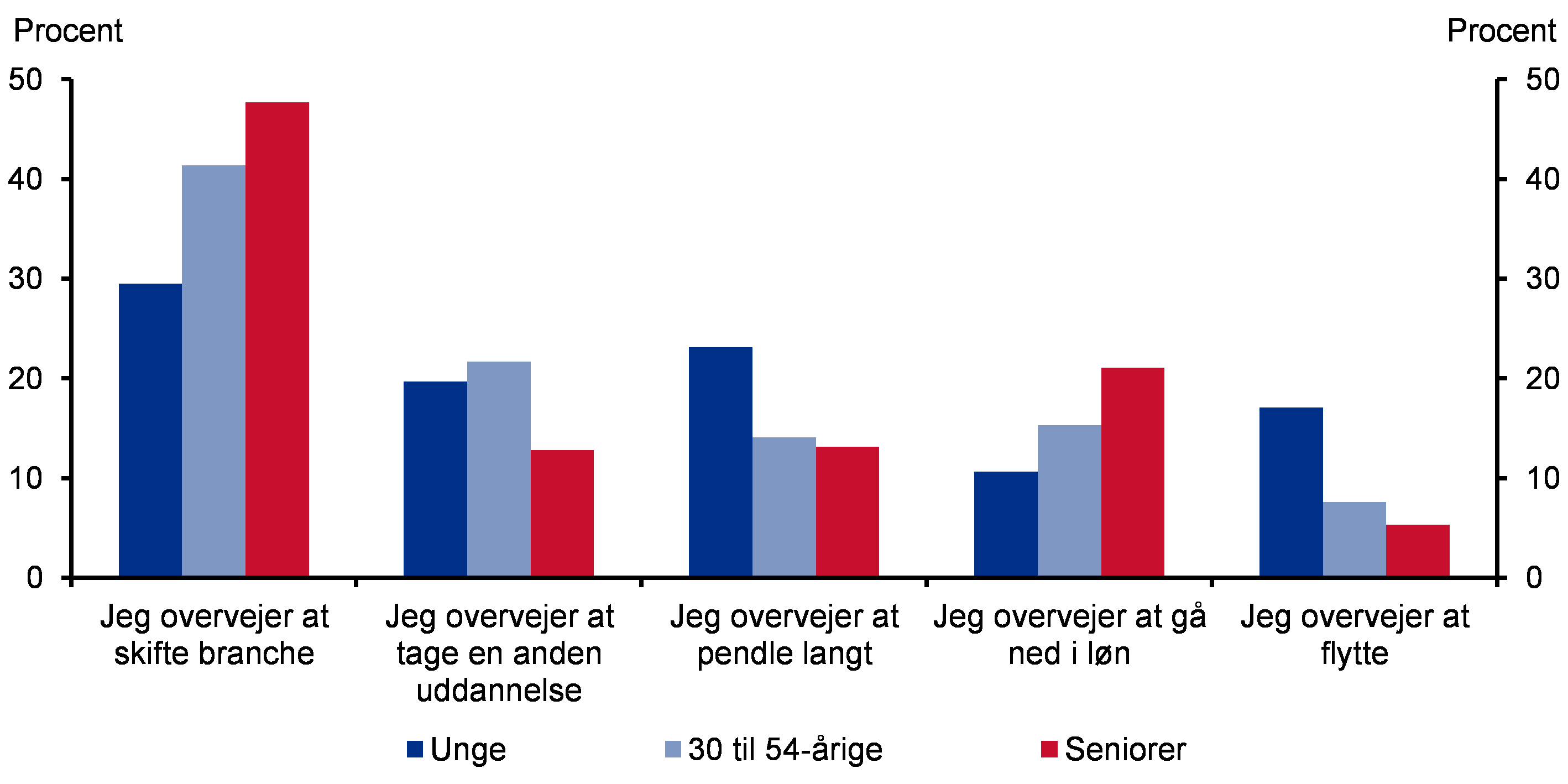 Til gengæld er seniorerne den gruppe, hvor færrest overvejer at tage en anden uddannelse, pendle langt eller at flytte. Det kan skyldes, at de, ligesom de 30 til 54-årige, ofte er etablerede, og det at flytte eller pendle for et job ikke er lige så let og attraktivt, som for de unge. Derudover er seniorerne alt andet lige den gruppe, der har kortest tid tilbage på arbejdsmarkedet, hvilket gør det mindre attraktivt at tage en ny uddannelse.