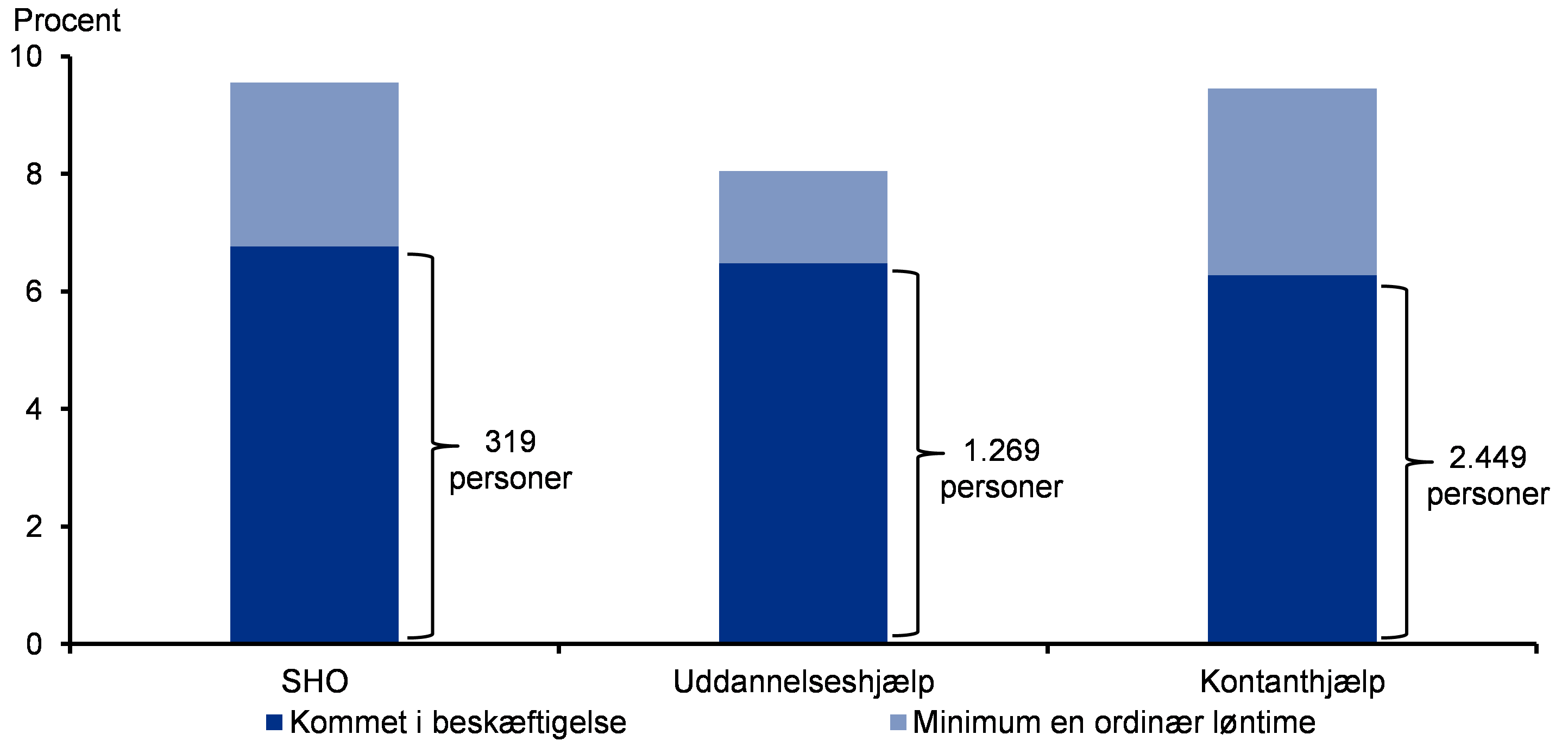 Anm.: Figur 2 viser andelen af udsatte ydelsesmodtagere, der henholdsvis havde minimum en ordinær løntime, og der kom i beskæftigelse i løbet af 2022. En udsat ledig opgøres som værende kommet i job, såfremt personen har haft fire sammenhængende uger med beskæftigelse inden for året, uden samtidigt at have modtaget en offentlig ydelse. En person har haft ordinære løntimer, hvis personen havde timer med løn i en virksomhed, imens vedkommende modtog hjælp i kontanthjælpssystemet. Populationen omfatter personer, der den sidste hele uge i året var aktivitetsparate og modtog enten kontanthjælp, uddannelseshjælp eller SHO-ydelse. Den samlede population består af 63.324 personer, hvoraf 4.719 er aktivitetsparate modtagere af SHO-ydelse, 19.586 er aktivitetsparate modtagere af uddannelseshjælp og 39.019 er aktivitetsparate modtagere af kontanthjælp.