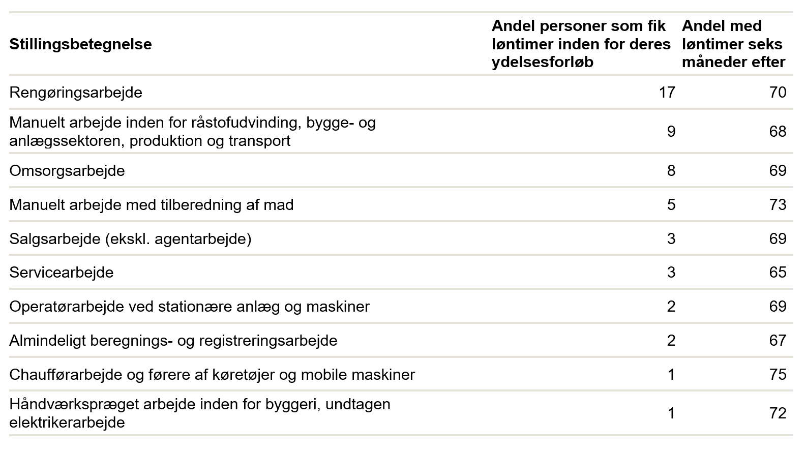Gruppen med løntimer inden for omsorgsarbejde havde den højeste gennemsnitlige arbejdstid efter seks måneder. Her steg den gennemsnitlige arbejdstid til 90 timer et halvt år efter den første løntime, hvilket svarer til stigning på 43 timer. Opgørelsen inkluderer både løntimer under ydelse og fuldtidsbeskæftigelse.