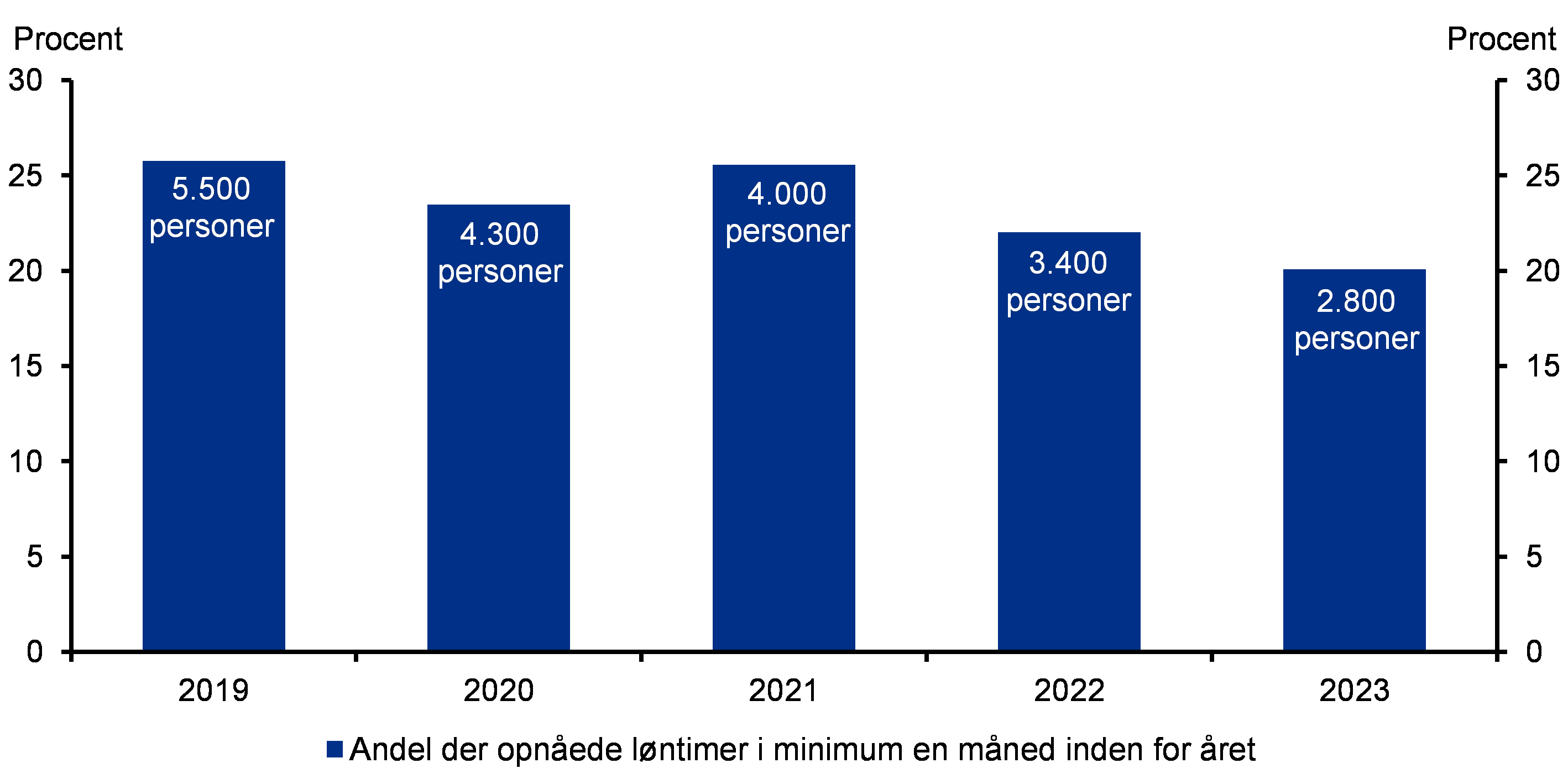 20 procent af målgruppen for arbejdspligt havde løntimer i 2023, svarende til lidt over 2.800 personer, jf. figur 1. Det er færre personer sammenlignet med de fire foregående år. Faldet i andelen med løntimer skal ses i lyset af, at målgruppen for arbejdspligten er blevet mindre i perioden 2019-2023, grundet en faldende tilgang til selvforsørgelses- og hjemrejseydelse eller overgangsydelse i disse år.