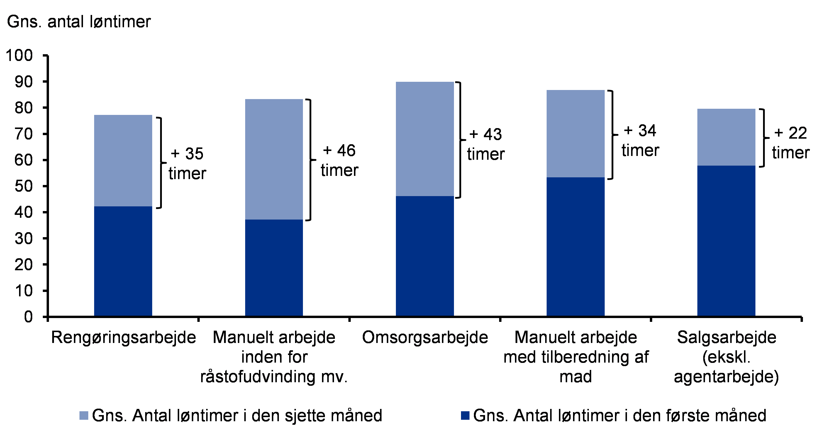 Der er forskel på antallet af løntimer blandt de fem mest populære stillingsbetegnelse, jf. figur 2. Gruppen med løntimer inden for rengøring øgede i gennemsnit deres arbejdstid med 35 timer – fra 42 til 77 timer om måneden - mens arbejdstiden steg med 46 timer blandt den gruppe, der arbejder med manuelt arbejde inden for råstofudvinding, bygge- og anlægssektoren, produktion og transport.