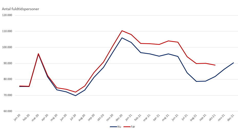 Dette betyder, at antallet af personer, fuldtidspersoner og de gennemsnitlige varigheder er reduceret væsentligt. Den største effekt ses de seneste måneder af 2021, fordi der er en akkumulerende virkning af at have sygedagpengeforløb stående åbne over en lang periode siden KSD’s opstart. I figuren ses antal fuldtidspersoner på jobindsats før særleverancen indgik i opgørelsen (før) og efter særleverancen er benyttet (nu).
