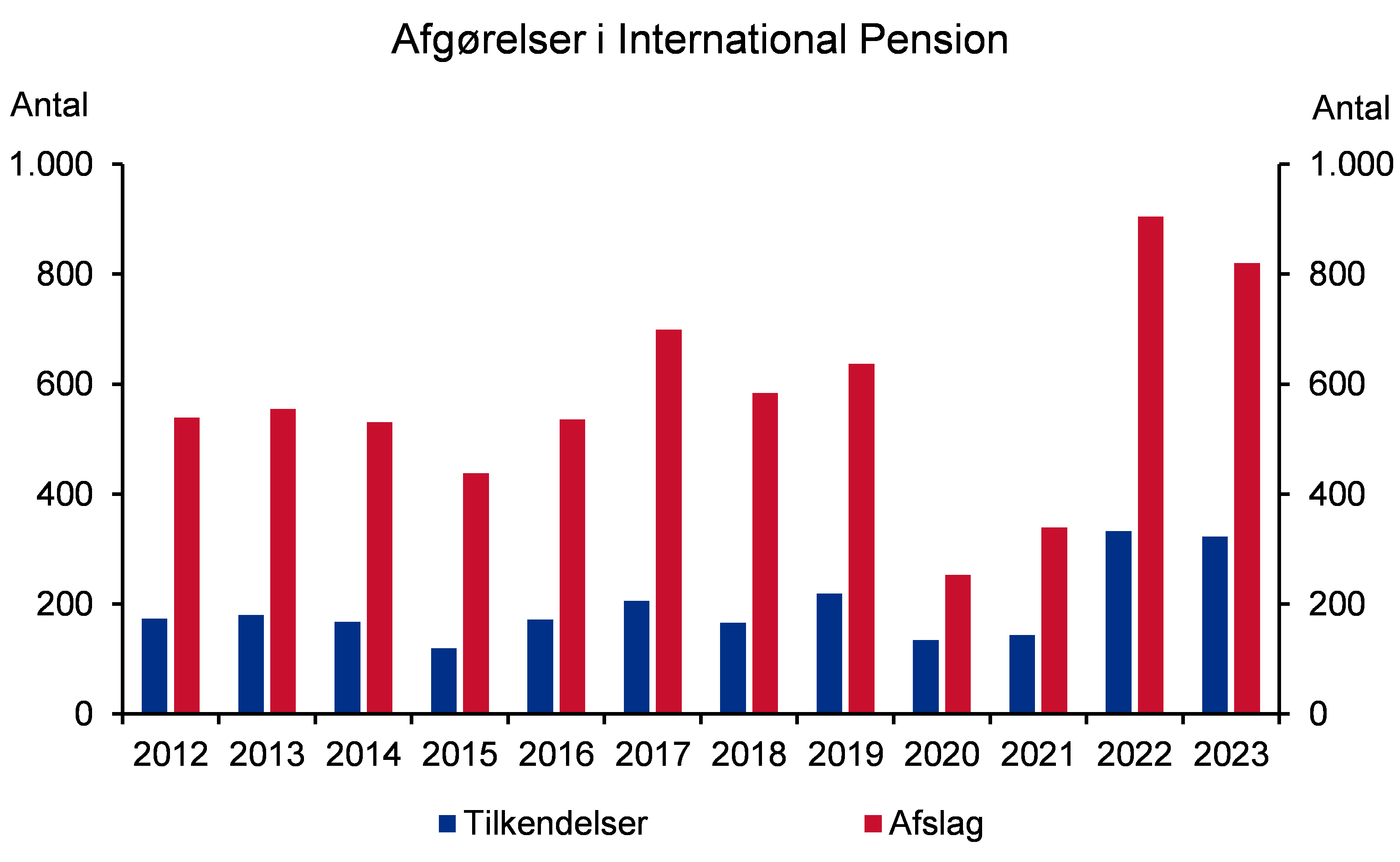 I 2023 blev der i alt afgjort 1.100 førtidspensionssager i International Pension. Det svarer til 5 procent af det samlede antal afgørelser i førtidspensionssager. I 28 procent af tilfældene blev borgeren tilkendt førtidspension.