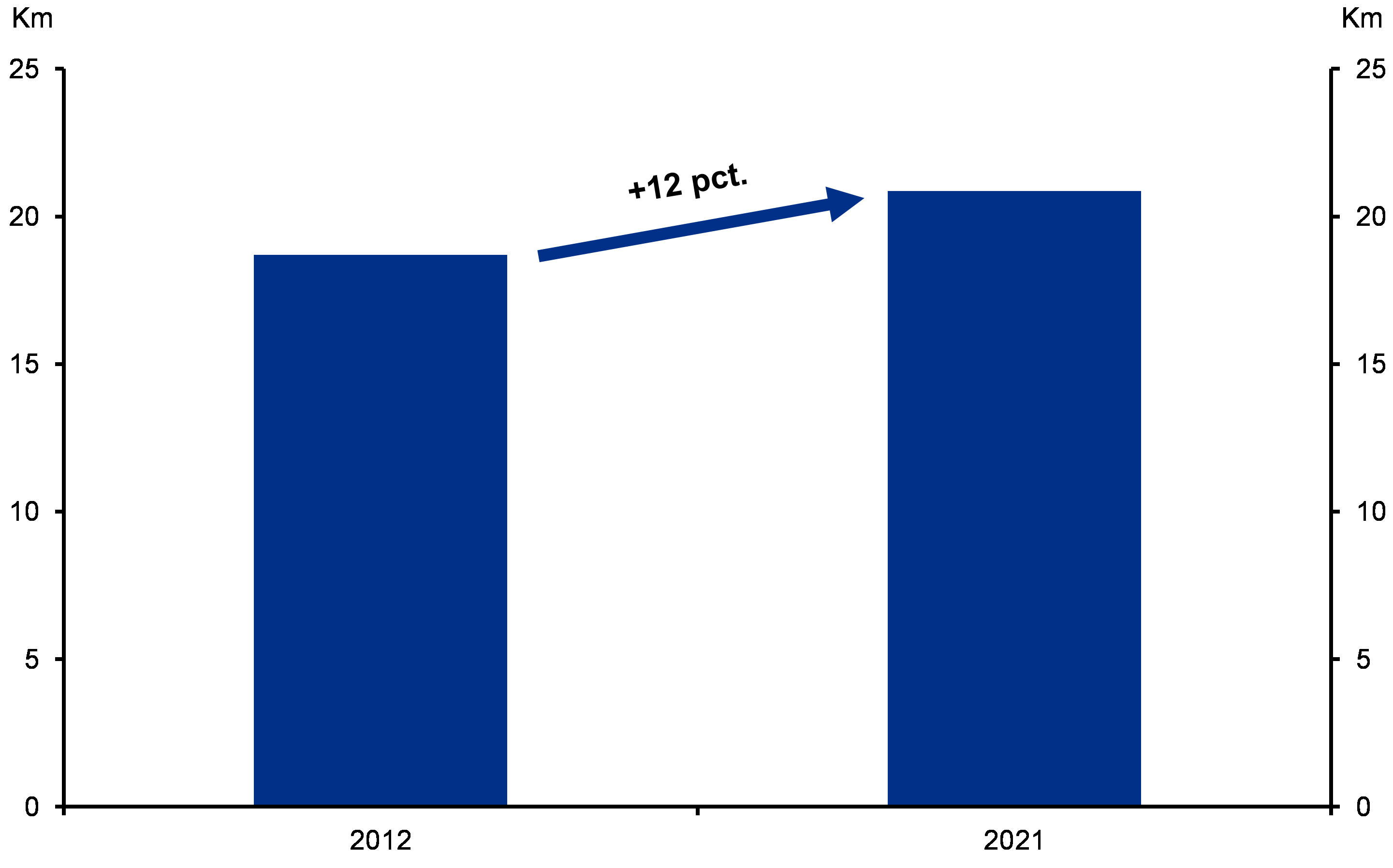 Udover at flere pendler på job, så har danskerne i gennemsnit fået længere til arbejde. Siden 2012 har danskerne i gennemsnit fået 2 kilometer længere fra bopæl til arbejdssted. Det svarer til en stigning i pendlingsafstanden på 12 procent, jf. figur 2. Det betyder, at danskerne i 2021 i gennemsnit pendlede 21 kilometer for at komme på arbejde.