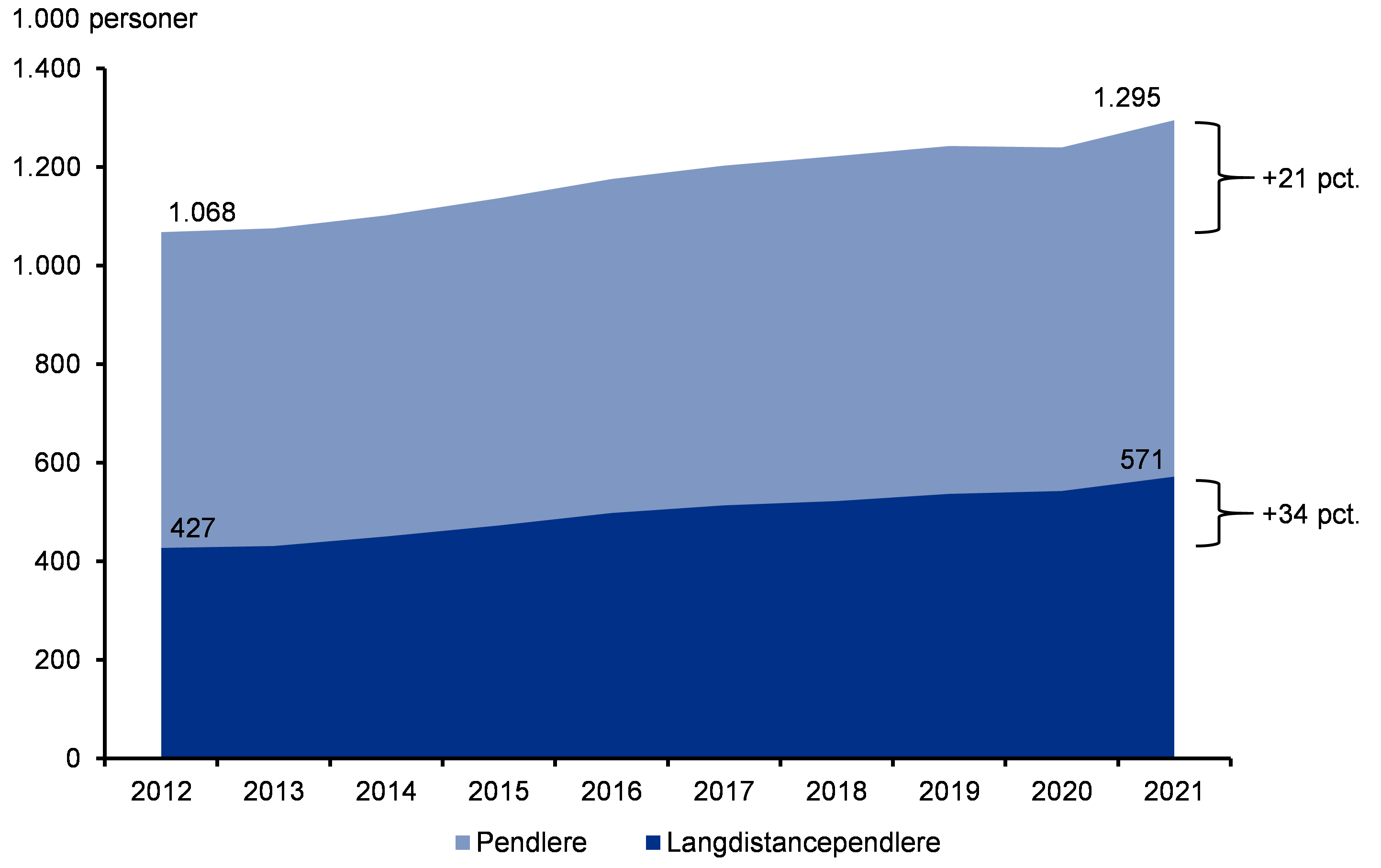 I 2021 pendlede knap 1,3 millioner danskere. Det svarer til 43 procent af alle beskæftigede danskere. I 2012 gjaldt det for 40 procent.