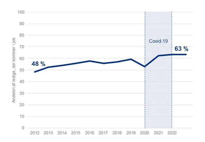 I den første uge af 2022 var der knap 93.000 ledige på det danske arbejdsmarked. I løbet af året kom cirka 59.000 af dem i job. Det svarer til 63 procent, hvilket er den højeste andel af ledige, der er kommet i job i løbet af et år siden 2012, jf. figur 1.