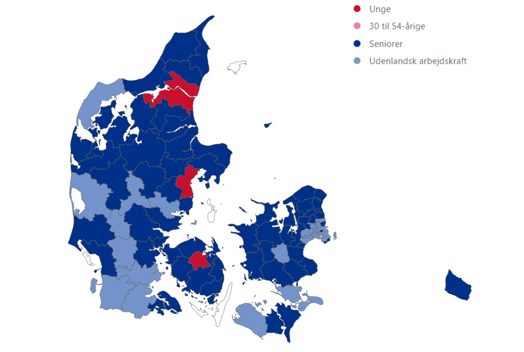Anm.: Figuren viser, hvilken gruppe der i hver kommune har oplevet den største absolutte ændring i lønmodtagerbeskæftigelsen fra 2019 til 2023. 93 af landets kommuner er udfyldt, og de fem ø-kommunerne er ikke repræsenteret grundet smalt datagrundlag. Kategorierne udgøres af danske statsborgere fordelt på tre aldersintervaller, samt udenlandske statsborgere. Udenlandske statsborgere dækker ikke over personer, der har opholdsgrundlaget RUT.
